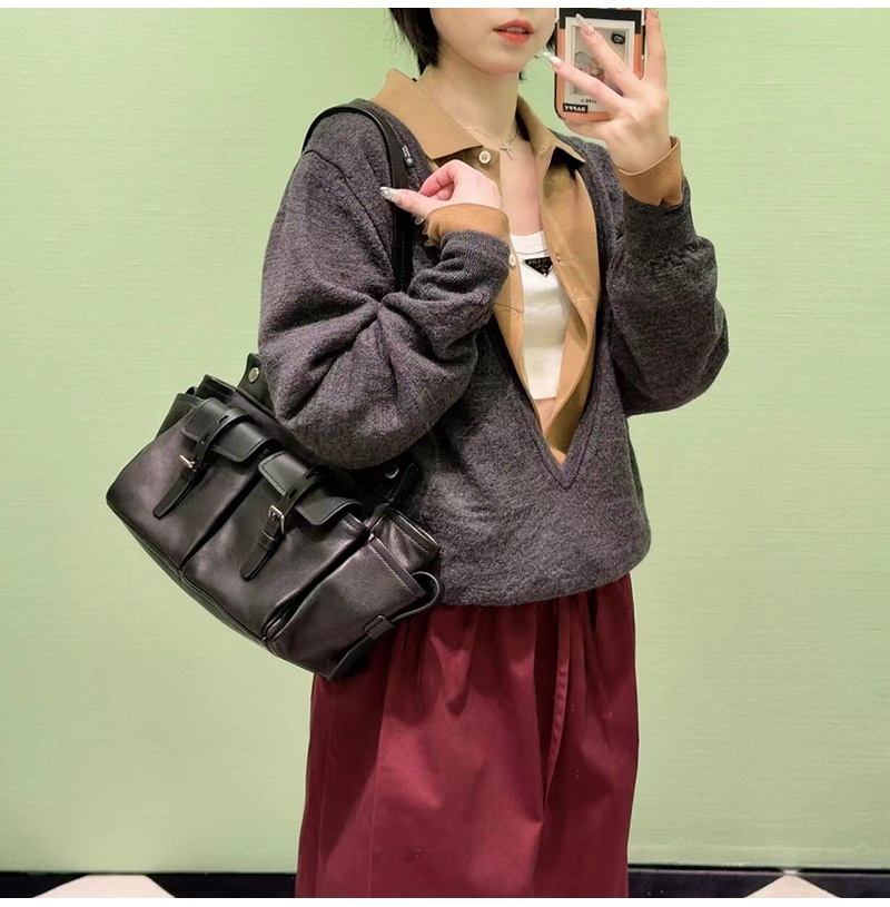 이 숄더백은 기능성과 장식적 요소를 겸비한 제품으로,